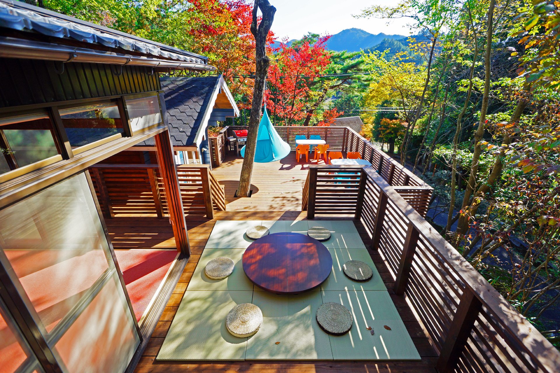二つの建物と広いウッドデッキにより、大人数での宿泊もOK